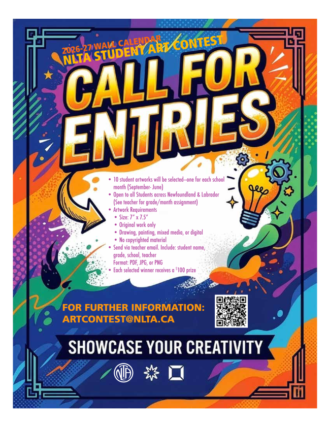 Prizes: Each selected student will receive a $100 prize and have their artwork featured in the 2026-27 NLTA wall calendar distributed to members across the province.